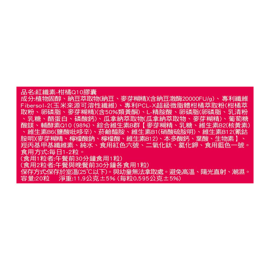 植物固醇、納豆萃取物(納豆、麥芽糊精)(含納豆激酶20000FU/g)、專利纖維Fibersol-2(玉米來源可溶性纖維)、專利PCL-X超級微脂體柑橘萃取粉(柑橘萃取粉、卵磷脂、麥芽糊精)(含50%類黃酮)、L-精胺酸、卵磷脂(卵磷脂、乳清粉、乳糖、酪蛋白、磷酸鈣)、瓜拿納萃取物(瓜拿納萃取物、麥芽糊精)、葡萄糖酸鎂、輔酵素Q10 (98%)、綜合維生素B群【麥芽糊精、乳糖、維生素B2(核黃素)、維生素B6(鹽酸吡哆辛)、菸鹼醯胺、維生素B1(硝酸硫胺明)、維生素B12(氰鈷胺明)(麥芽糊精、檸檬酸鈉、檸檬酸、維生素B12)、本多酸鈣、葉酸、生物素】、羥丙基甲基纖維素、純水、食用紅色六號、二氧化鈦、氯化鉀、食用藍色一號。