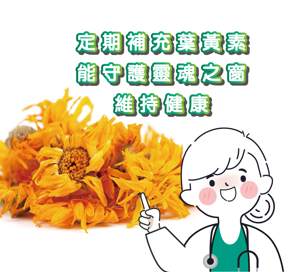 成分:魚油、山桑子萃取物(80mg/粒)、枸杞精華萃取物(50mg/粒)、植物DHA藻粉(40mg/粒)、金盞花萃取物(含專利HI-FIL葉黃素;30mg/粒)、牛磺酸(20mg/粒)、小米草萃取物(20mg/粒)、氧化鋅(20mg/粒)、維生素B1(1.1mg/粒)、維生素B2(1mg/粒)、維生素B6(1mg/粒)、玉米黃素(1mg/粒)、β-胡蘿蔔素(600mcg/粒=維生素A100mcg=330IU)、維生素A(500mcg=1650IU/粒)、維生素B12(1.5mcg/粒)。
