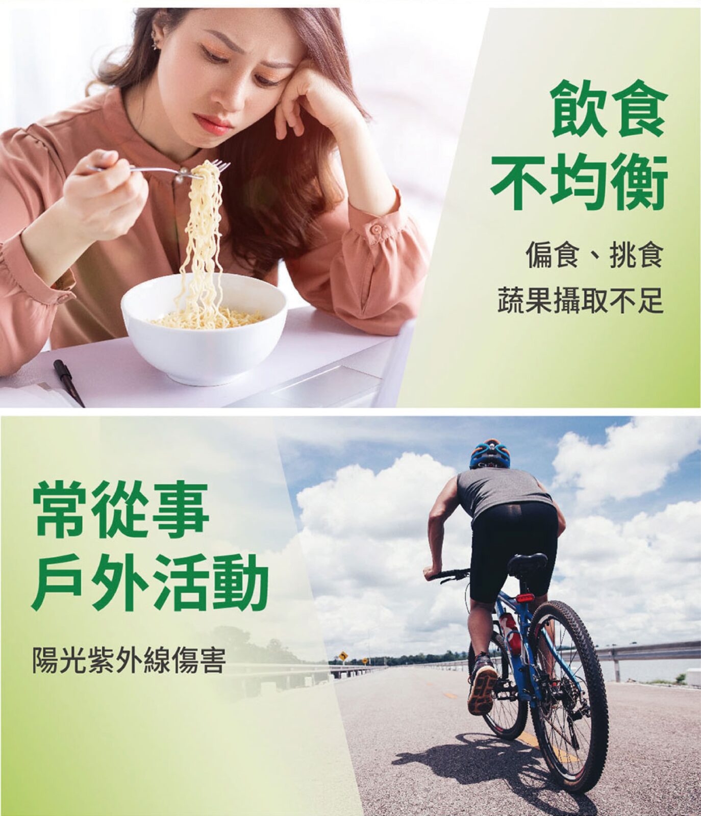 成分:白樺菌菇萃取物40mg/粒、日本HI-MAX金盞花萃取物 (含專利葉黃素)30mg/粒、葡萄籽萃取物、海藻萃取(含植物性DHA)、葡萄糖酸鋅、牛磺酸、山桑子萃取物、枸杞萃取物、小米草萃取物、維生素A、β-胡蘿蔔素、維生素B1、維生素B2、維生素B6、玉米黃素、維生素B12。