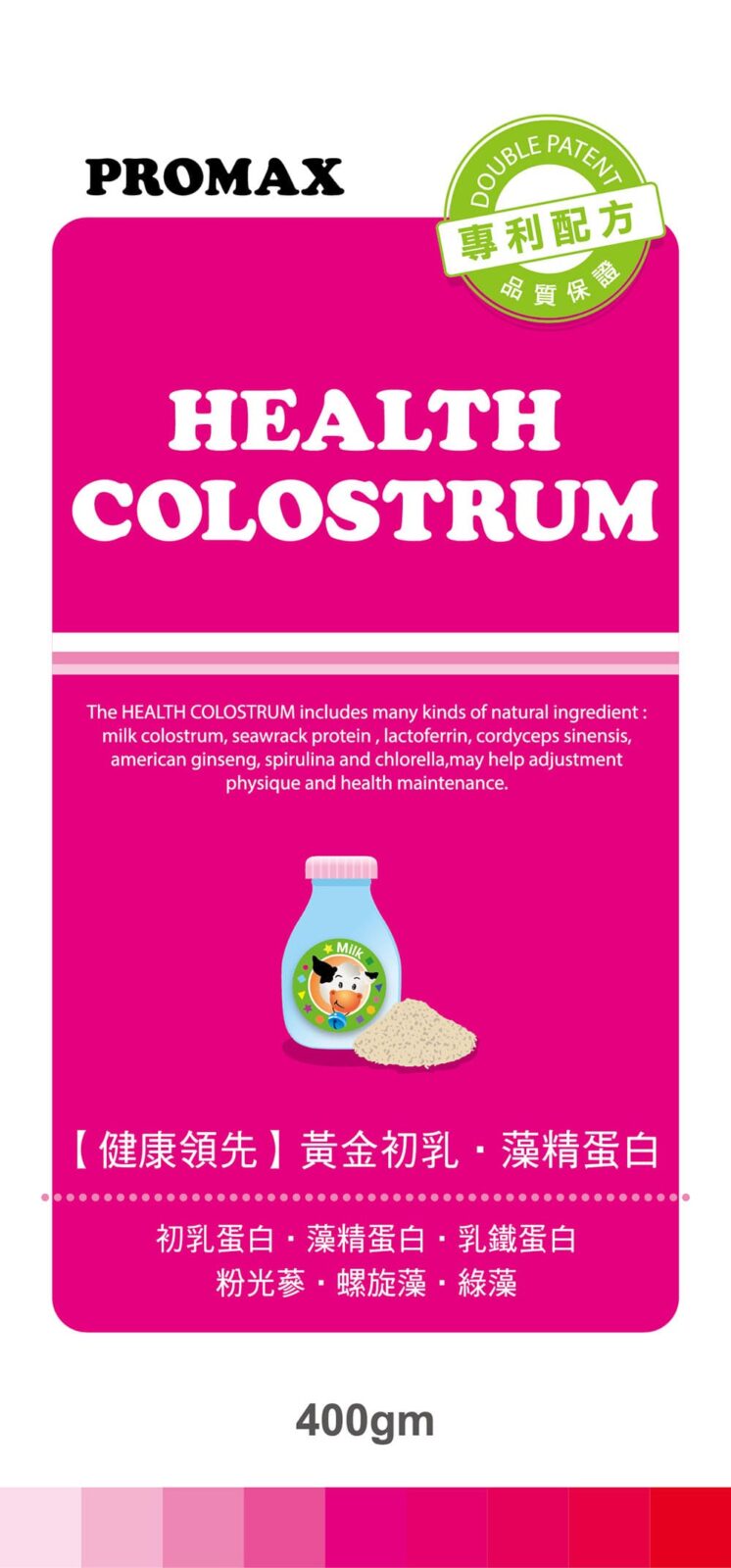 成分:牛奶固形物、牛奶萃取物(含乳清蛋白、乳鐵蛋白、L-麩醯胺酸)、黃金牛初乳蛋白粉、藻類萃取物(含藻精蛋白)、啤酒酵母、專利LABCOTTM乳酸菌(1X1010 cfu/g)、果寡醣、螺旋藻(藍藻)、綠藻、檸檬酸鈣、黃金菊、粉光蔘、花粉、碳酸鈣、維生素C、本多酸鈣、菸鹼酸胺、重酒石酸膽鹼、肌醇、葡萄糖酸亞鐵、氧化鋅、維生素B2、維生素B6、維生素B1、葉酸、生物素、維生素B12、維生素D3。